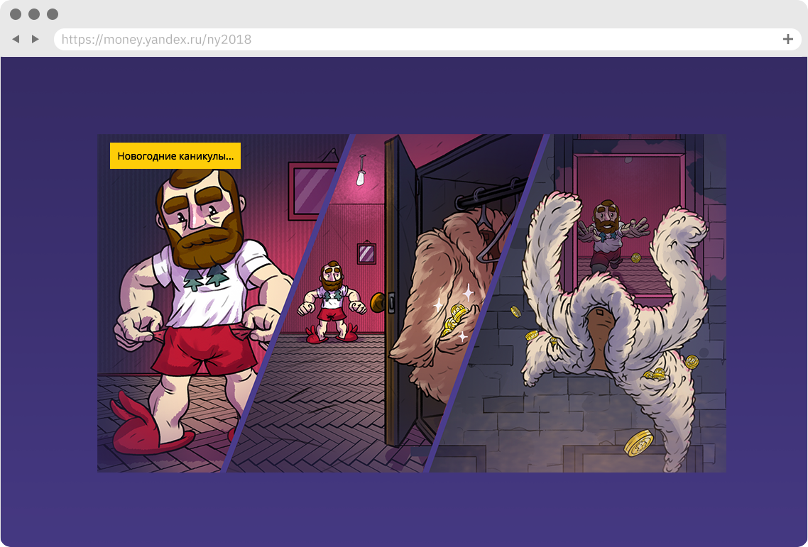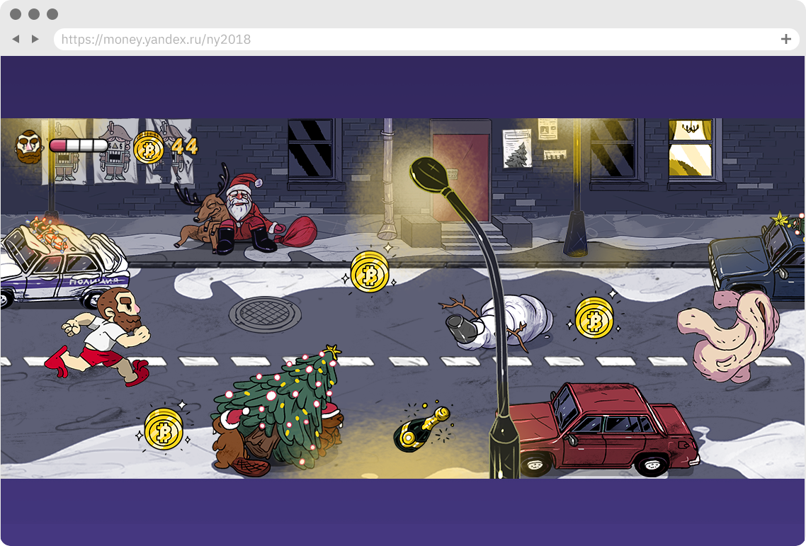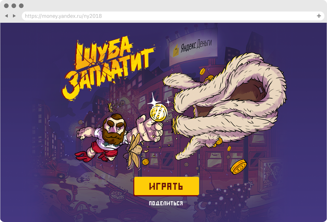 Игра-платформер для Яндекс.Денег. Ещё один яркий проект в безумных условиях. Усатый мужик преследует по заснеженному российскому городу сбежавшую шубу, отстреливающуюся молью.