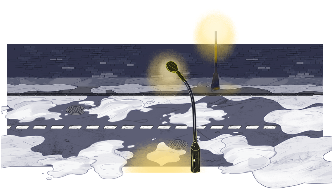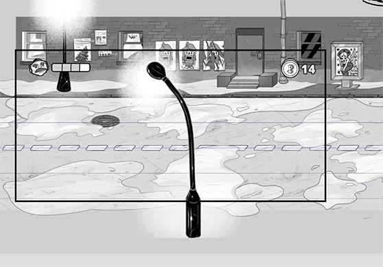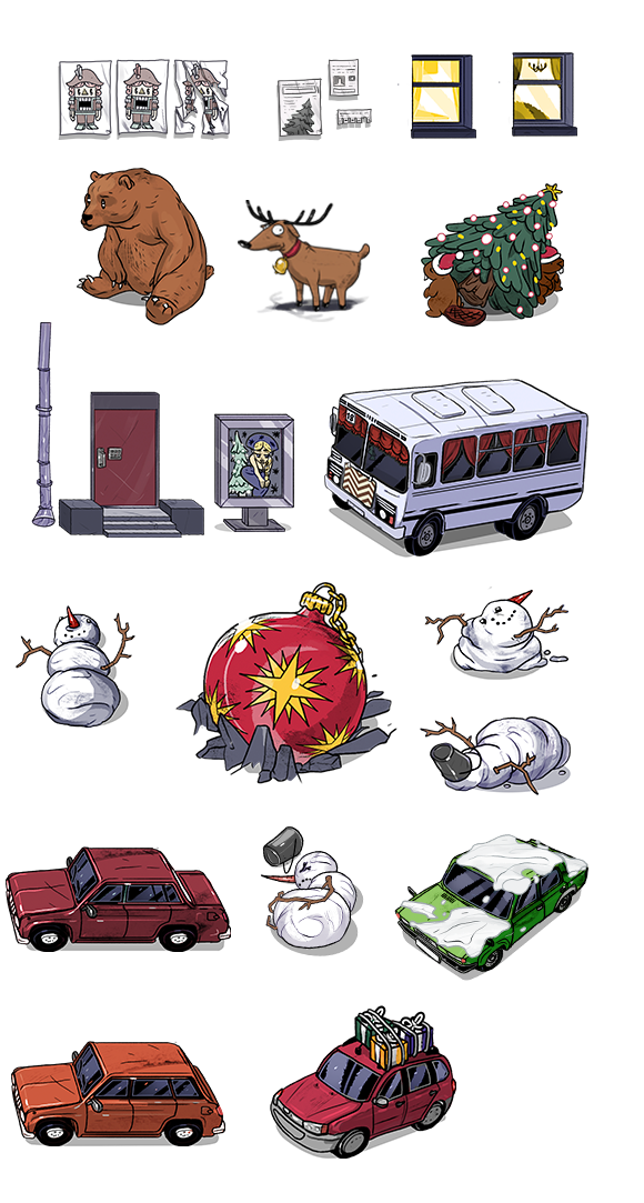 Герой ведёт преследование по бесконечной заснеженной дороге предновогоднего города Энска, встречая странных прохожих и пробираясь через последствия праздничной суеты. Графика для игры:
